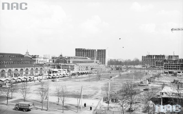 Teren budowy Osiedla Za Żelazną Bramą, od strony ul. J. Marchlewskiego. Widoczna hala Mirowska i hala Gwardii. Źródło: Archiwum Fotograficzne Zbyszka Siemaszki